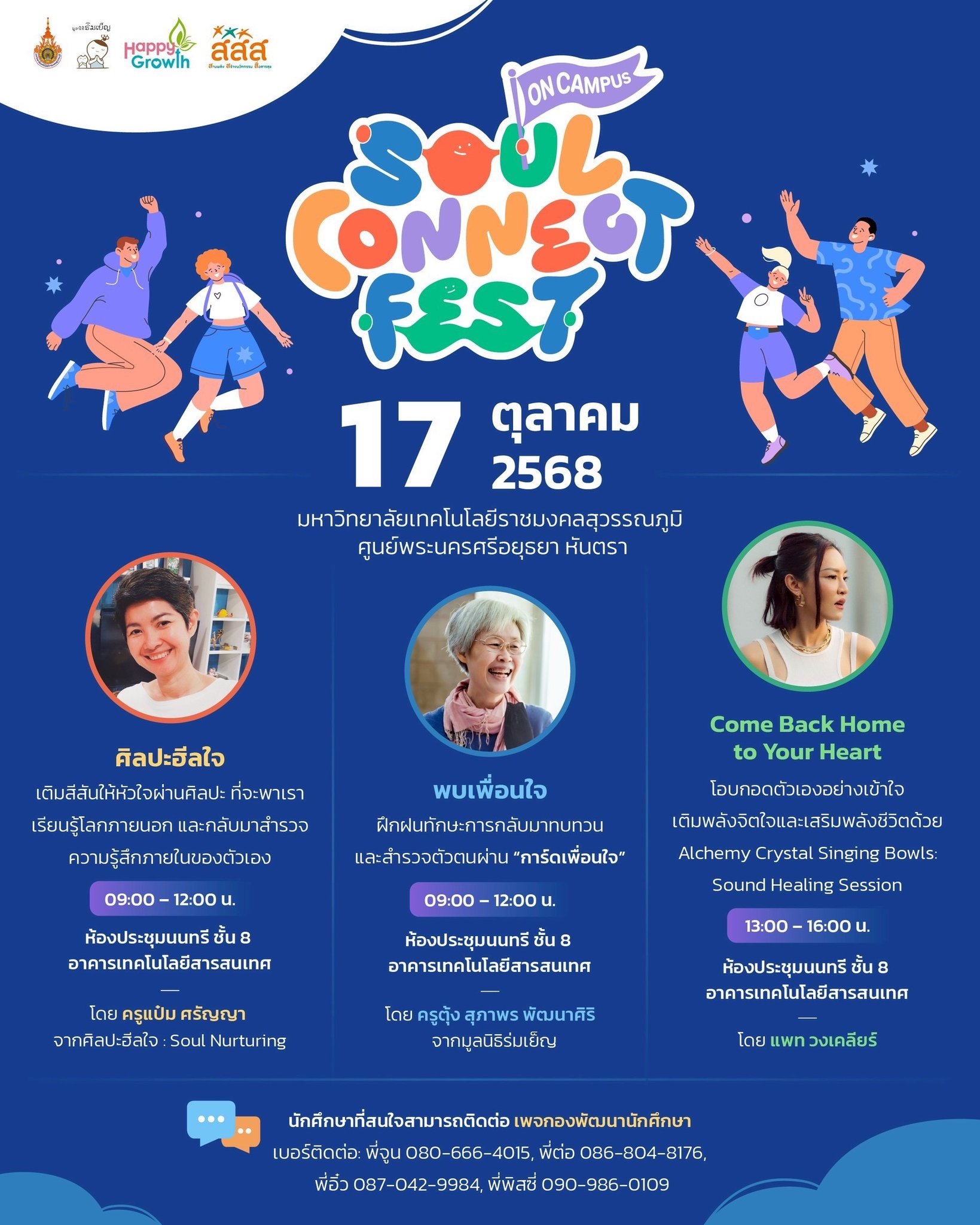 Tag : #rus #rmutsb #กองพัฒนานักศึกษา #มทร.สุวรรณภูมิ #ขอเชิญชวนน้องๆ นักศึกษาเข้าร่วมงาน Soul Connect Fest on Campus