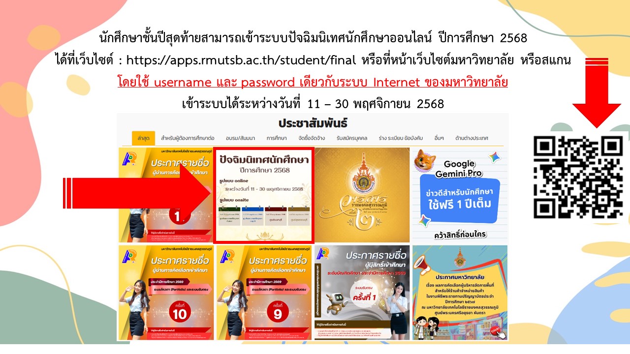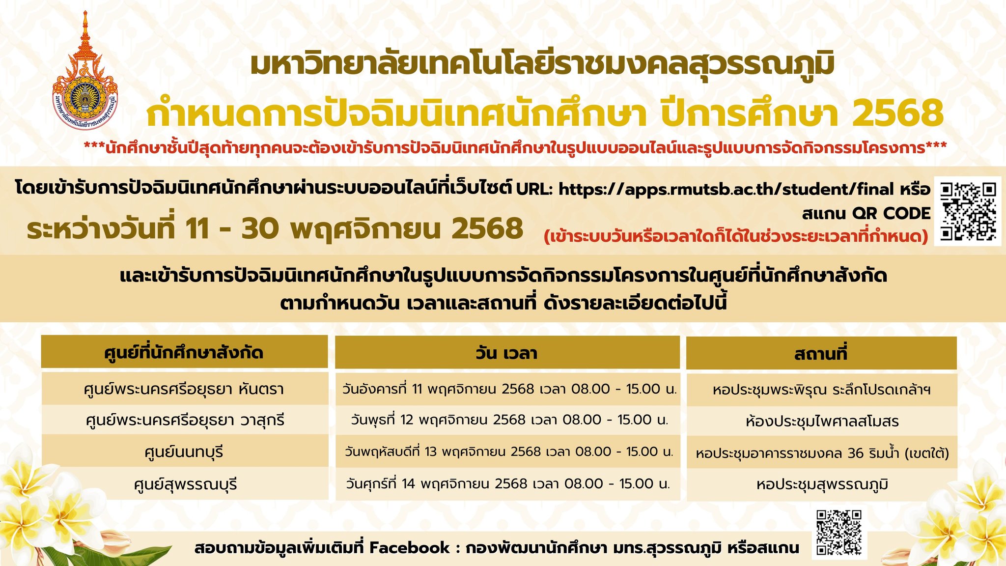 Tag : #rus #rmutsb #กองพัฒนานักศึกษา #มทร.สุวรรณภูมิ #🎯🎯ประชาสัมพันธ์กำหนดการปัจฉิมนิเทศนักศึกษา ปีการศึกษา 2568🎯🎯