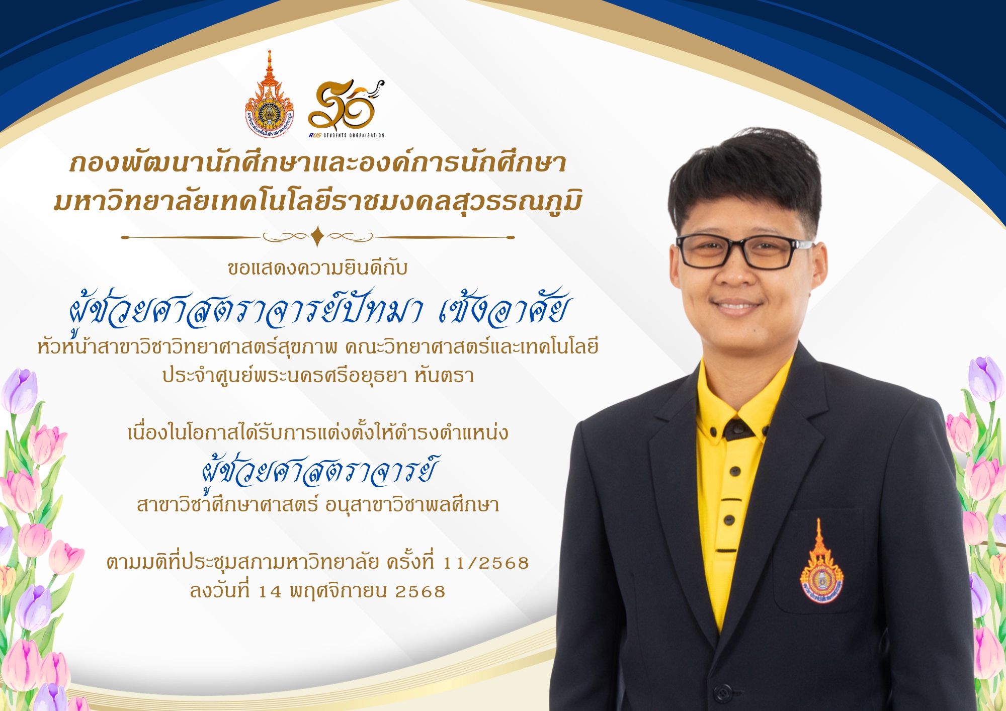 Tag : #rus #rmutsb #กองพัฒนานักศึกษา #มทร.สุวรรณภูมิ #ขอแสดงความยินดีกับ ผู้ช่วยศาสตราจารย์ปัทมา เซ้งอาศัย เนื่องในโอกาสได้รับการแต่งตั้งให้ดำรงตำแหน่ง ผู้ช่วยศาสตราจารย์