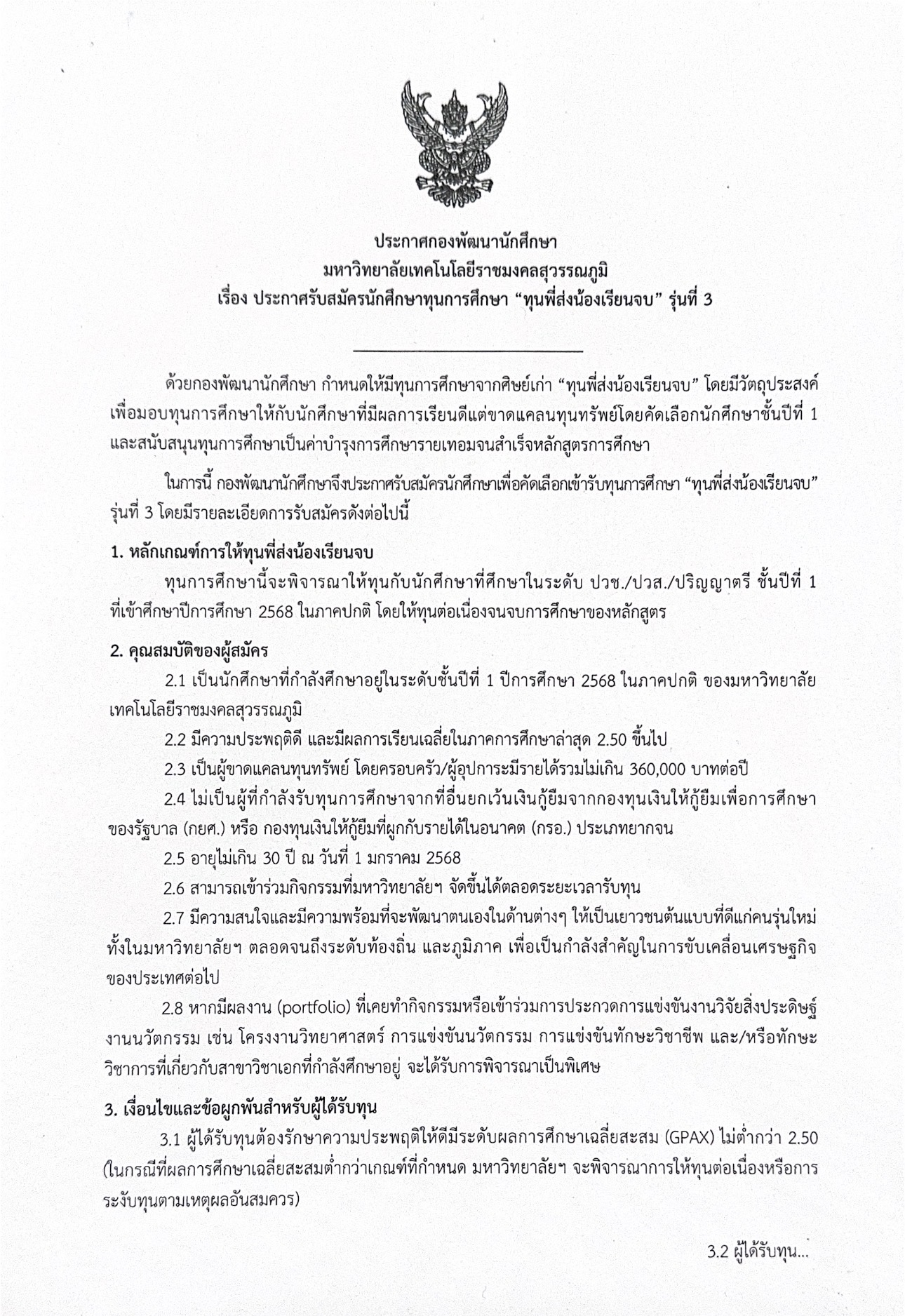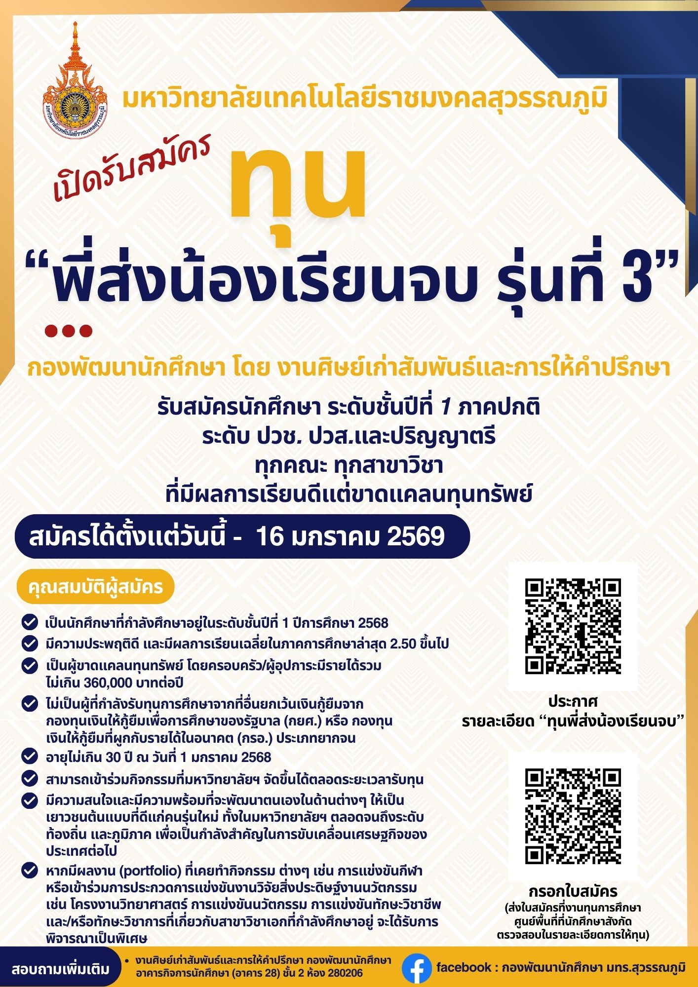 Tag : #rus #rmutsb #กองพัฒนานักศึกษา #มทร.สุวรรณภูมิ #เปิดรับสมัคร "ทุนพี่ส่งน้องเรียนจบ รุ่นที่ 3"