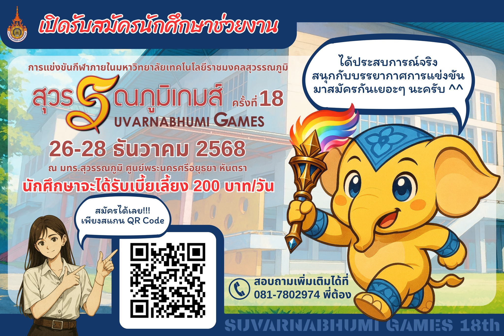 เปิดรับสมัครนักศึกษาช่วยงาน การแข่งขันกีฬาภายในมหาวิทยาลัยเทคโนโลยีราชมงคลสุวรรณภูมิ