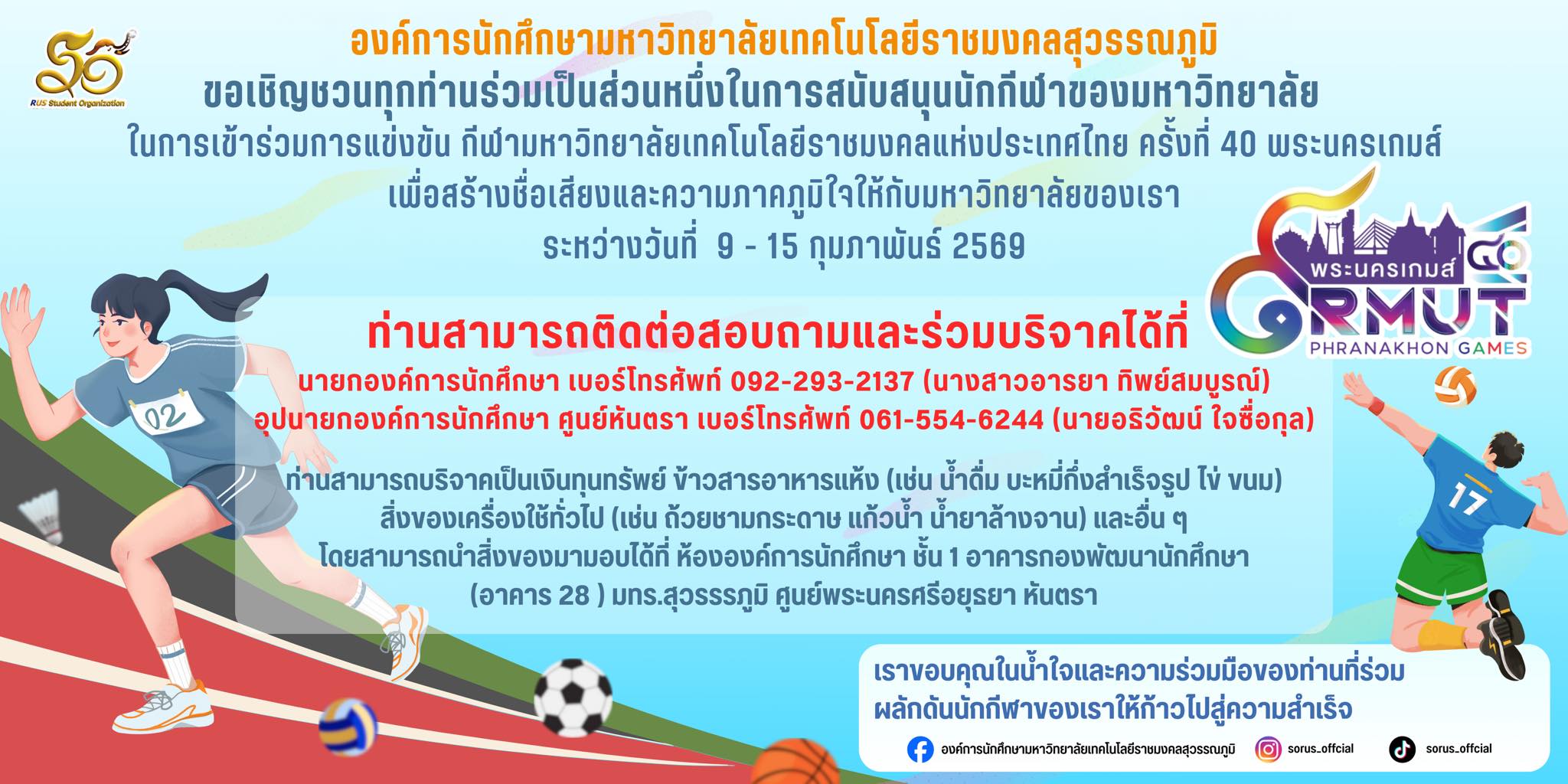 Tag : #rus #rmutsb #กองพัฒนานักศึกษา #มทร.สุวรรณภูมิ #ขอเชิญชวนทุกท่านร่วมเป็นส่วนหนึ่งในการสนับสนุนทัพนักกีฬาของมหาวิทยาลัย เพื่อเข้าร่วมการแข่งขันกีฬาพระนครเกมส์