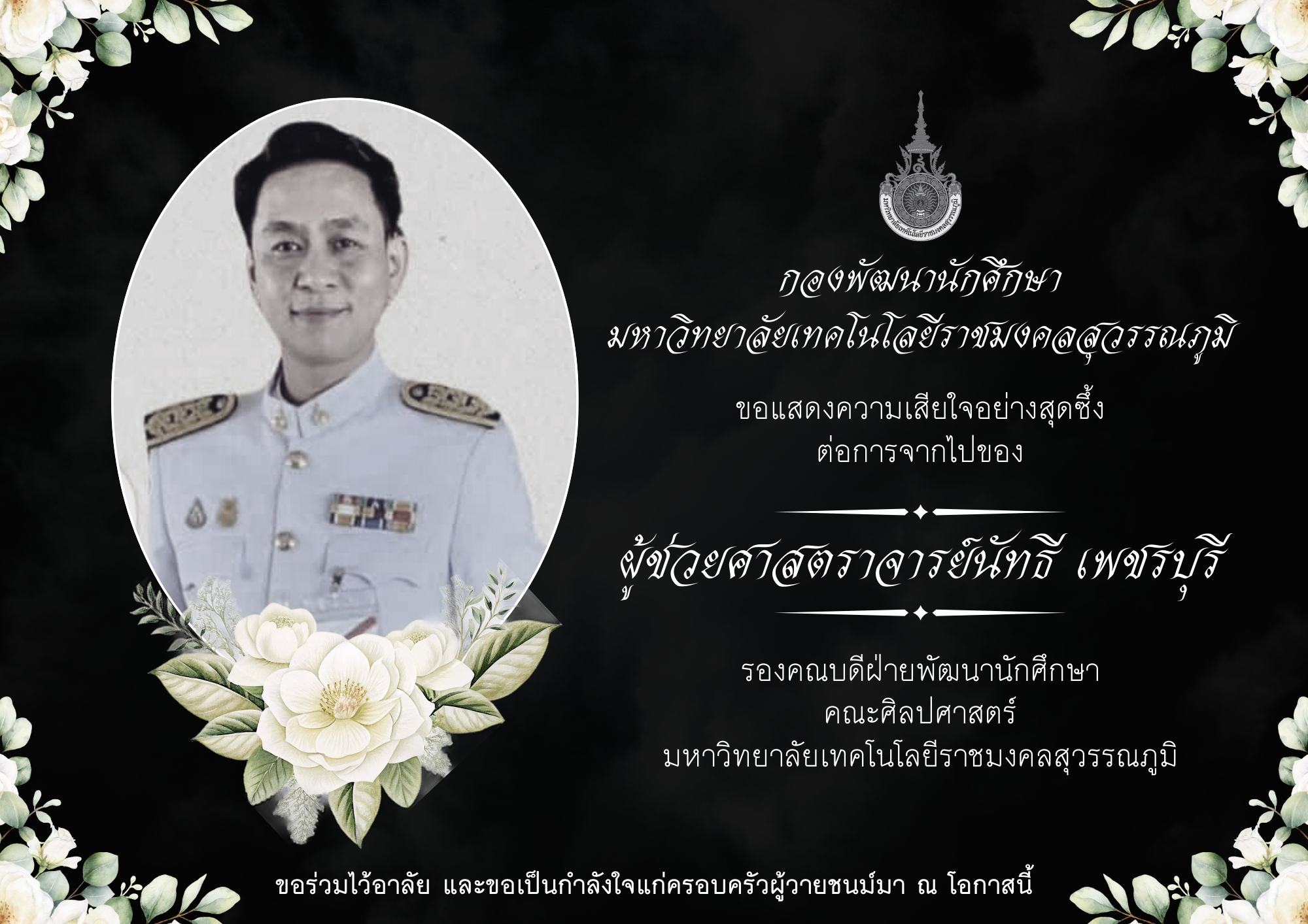Tag : #rus #rmutsb #กองพัฒนานักศึกษา #มทร.สุวรรณภูมิ #ขอแสดงความเสียใจอย่างสุดซึ้ง ต่อการถึงแก่อนิจกรรมของ ผู้ช่วยศาสตราจารย์นัทธี เพชรบุรี
