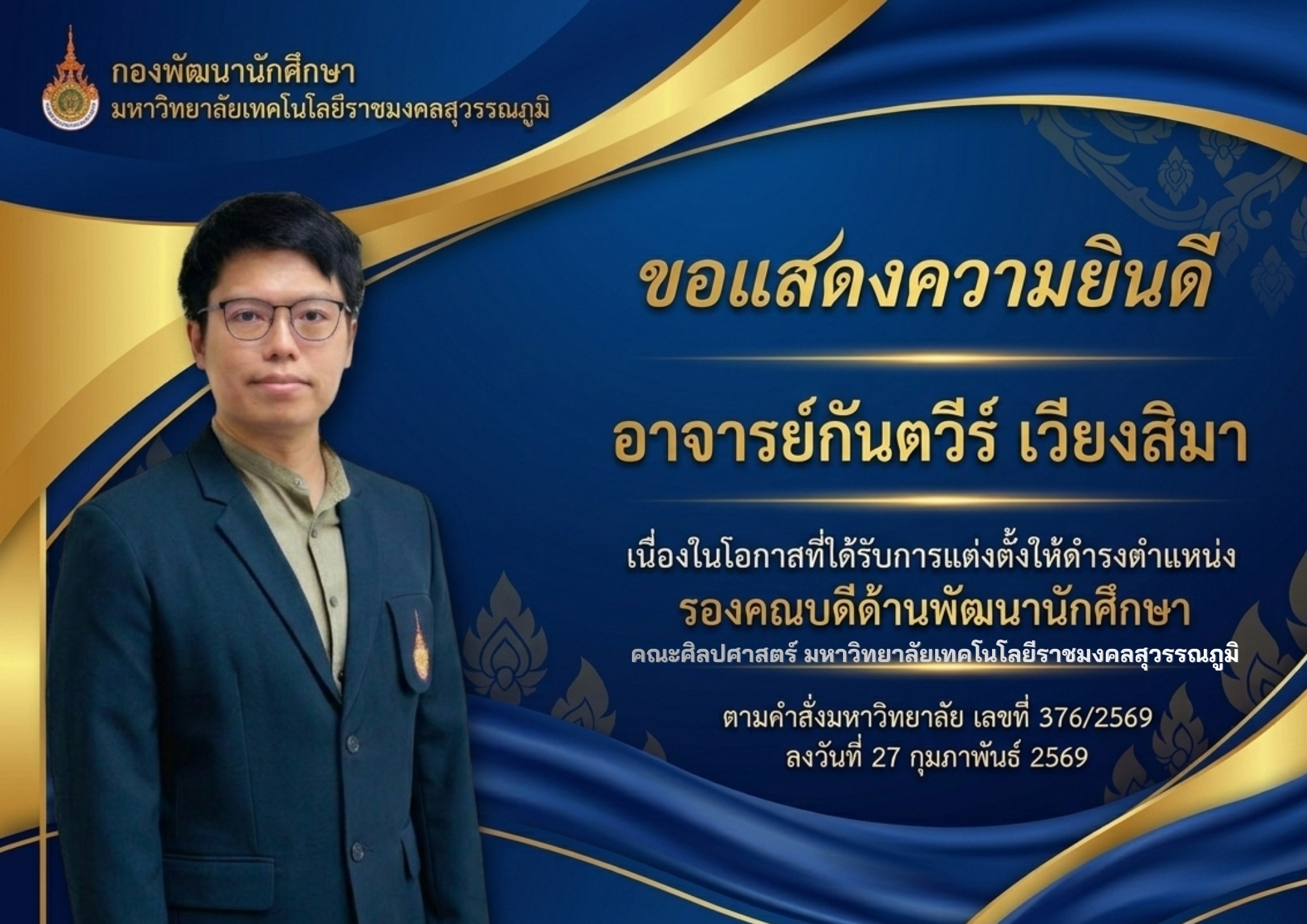 Tag : #rus #rmutsb #กองพัฒนานักศึกษา #มทร.สุวรรณภูมิ #ขอแสดงความยินดี อาจารย์กันตวีร์ เวียงสิมา เนื่องในโอกาสที่ได้รับการแต่งตั้งให้ดำรงตำแหน่ง รองคณบดีด้านพัฒนานักศึกษา