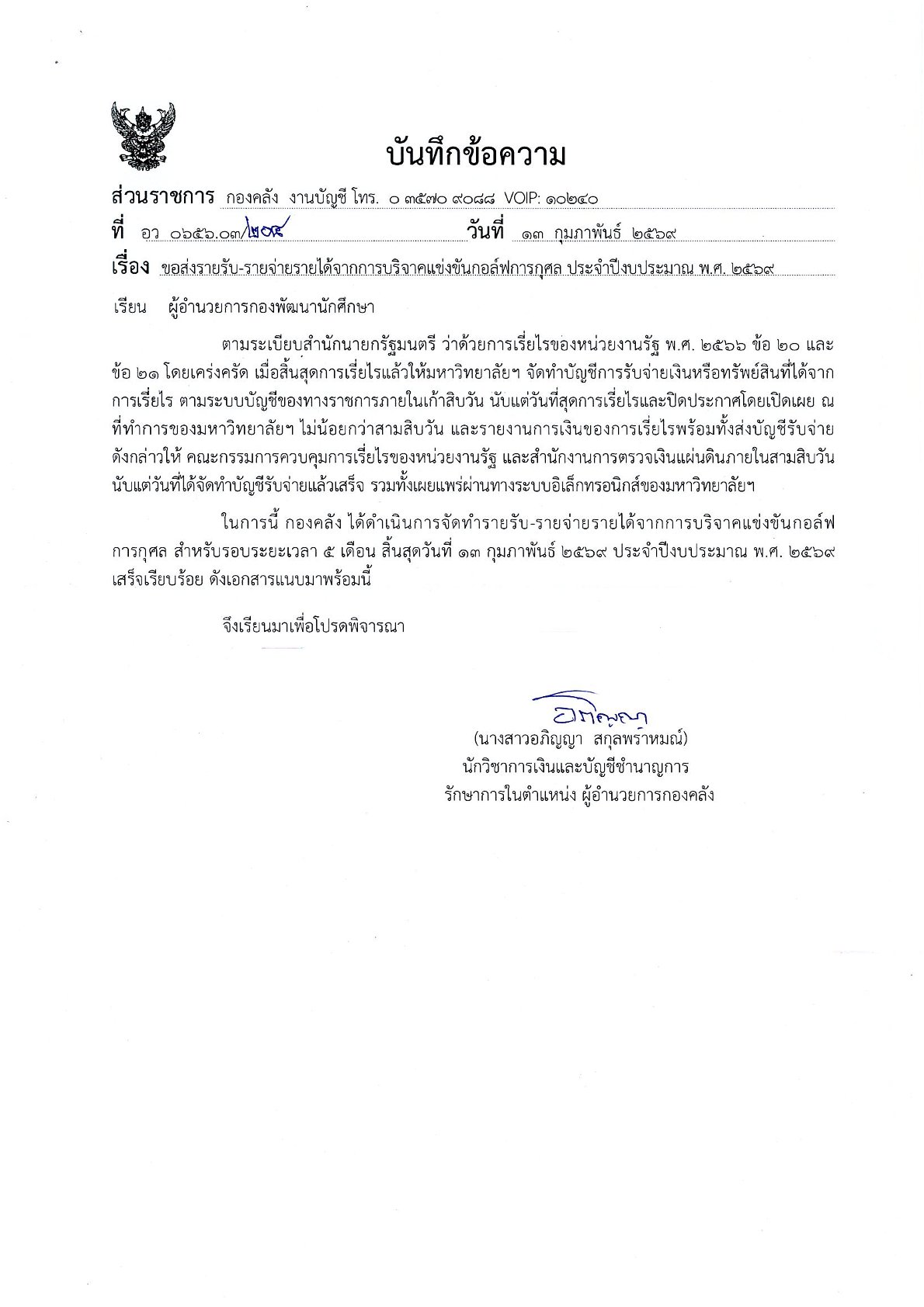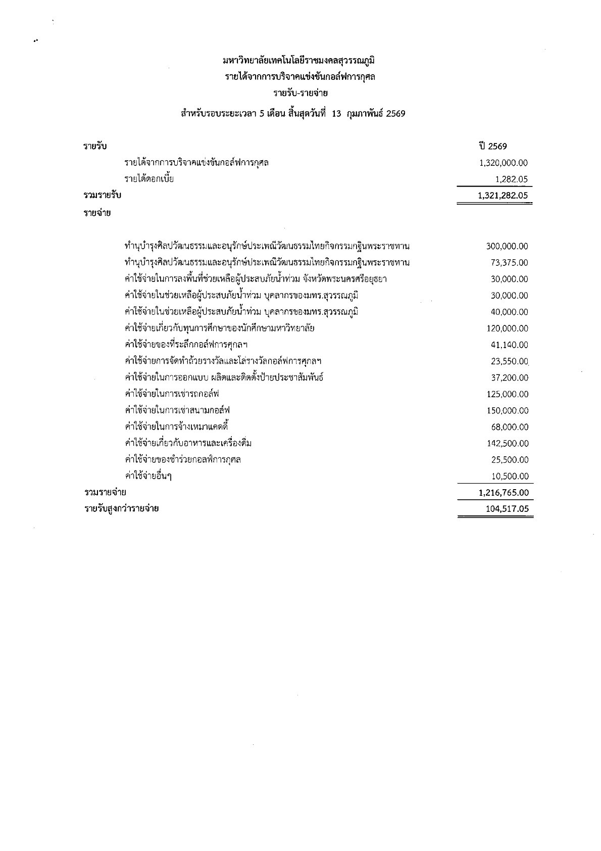 Tag : #rus #rmutsb #กองพัฒนานักศึกษา #มทร.สุวรรณภูมิ #รายรับ-รายจ่ายรายได้บริจาคแข่งขันกอล์ฟการกุศล ปี 2569