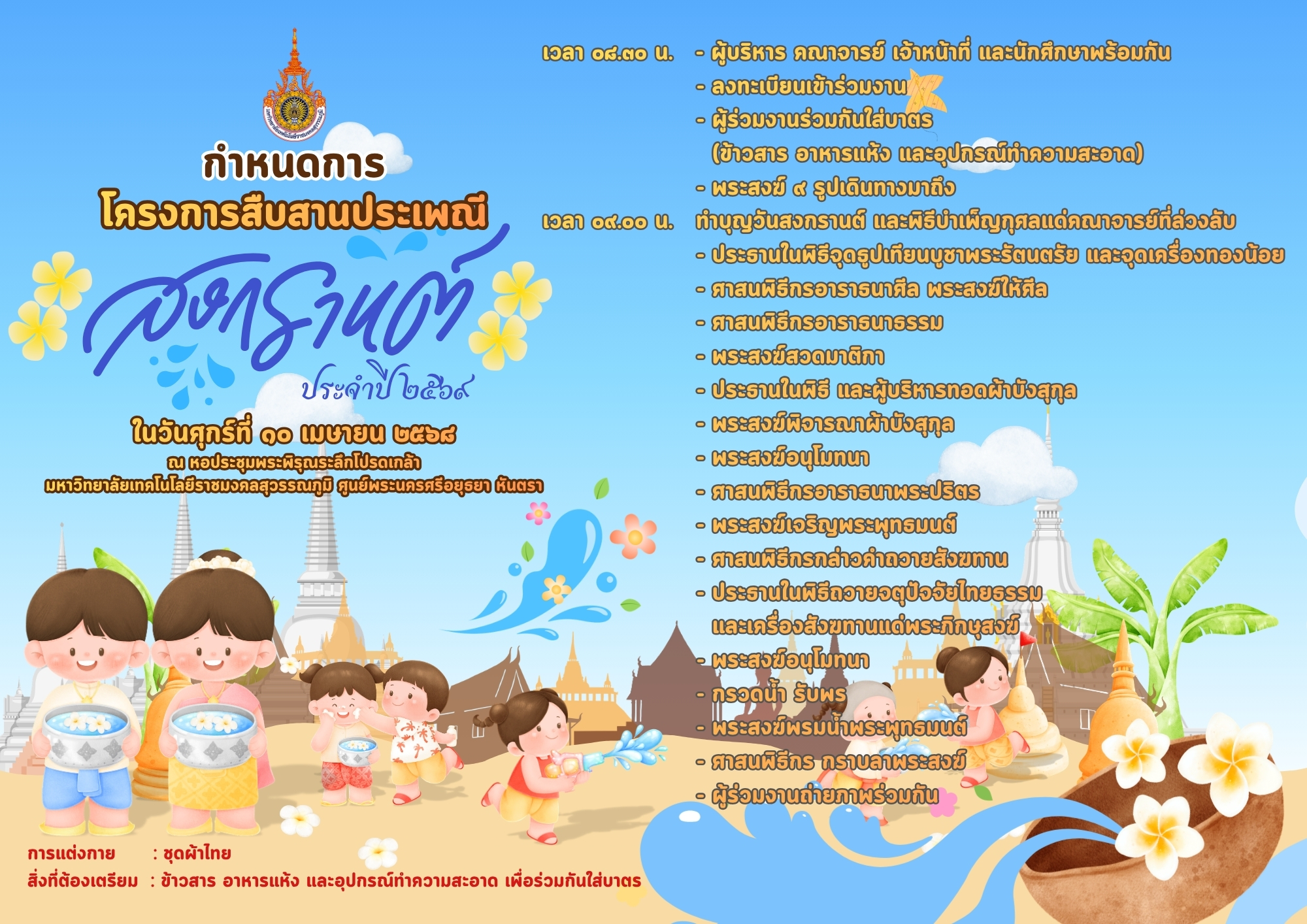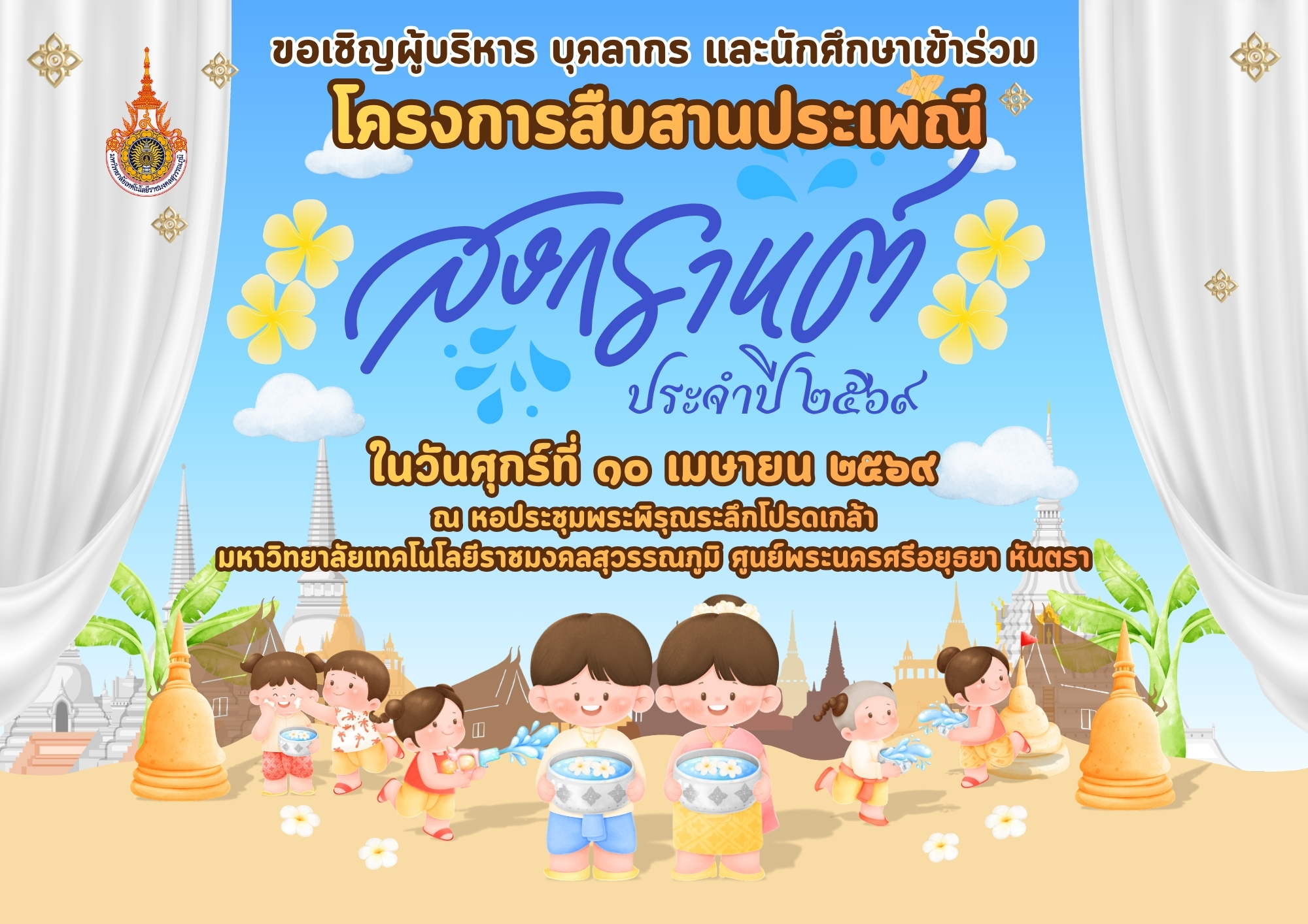 ขอเชิญผู้บริหาร บุคลากร และนักศึกษา เข้าร่วม โครงการสืบสานประเพณีสงกรานต์ ประจำปี ๒๕๖๙