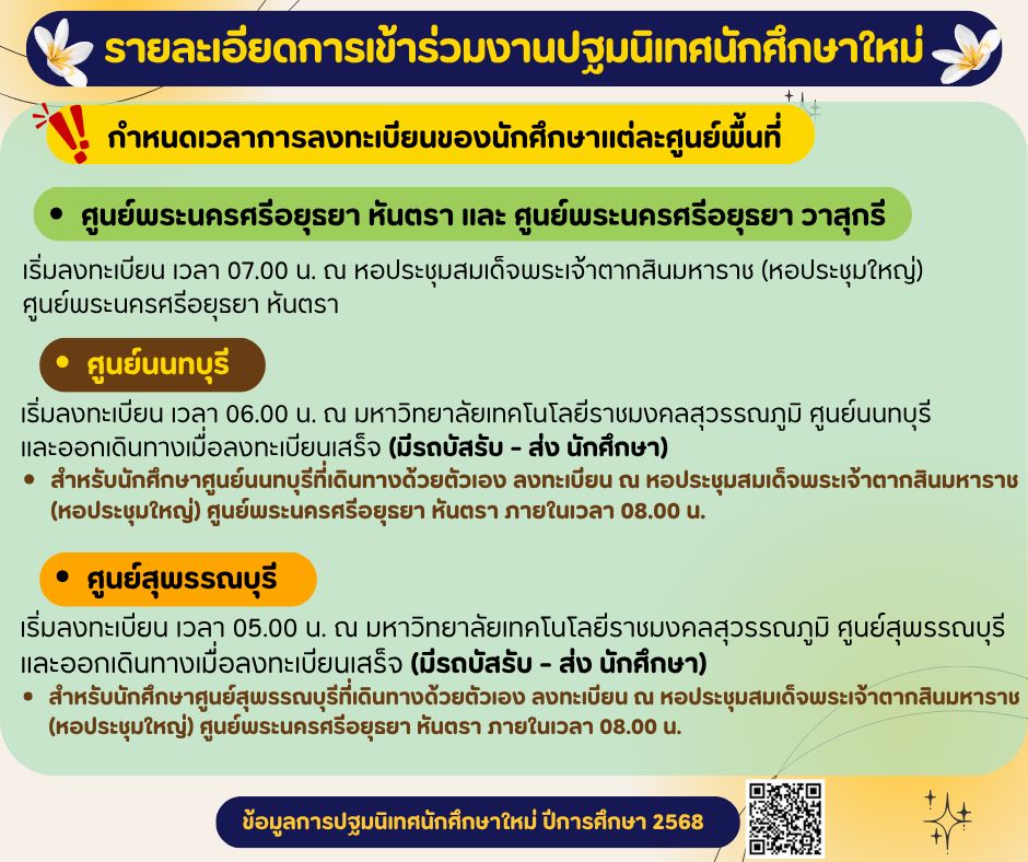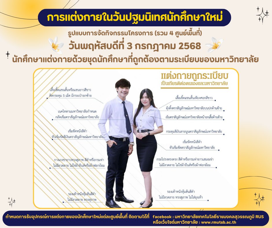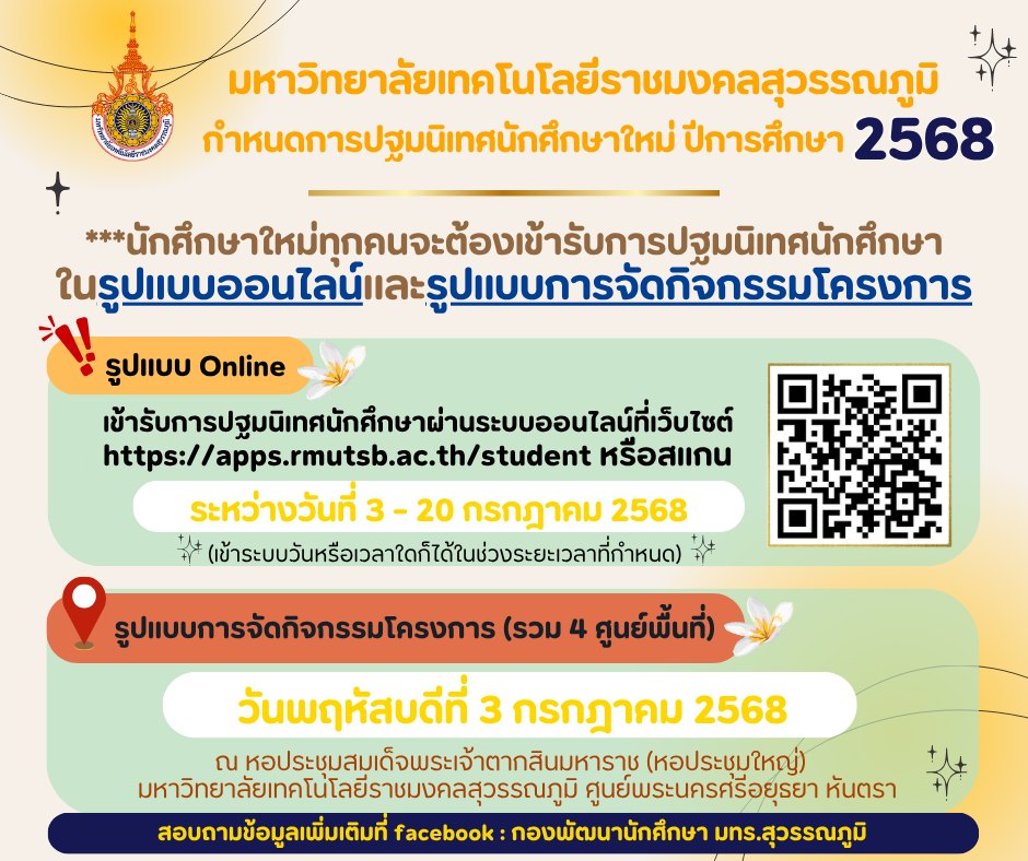 Tag : #rus #rmutsb #กองพัฒนานักศึกษา #มทร.สุวรรณภูมิ #ประชาสัมพันธ์กำหนดการปฐมนิเทศนิเทศนักศึกษาใหม่ ปีการศึกษา 2568