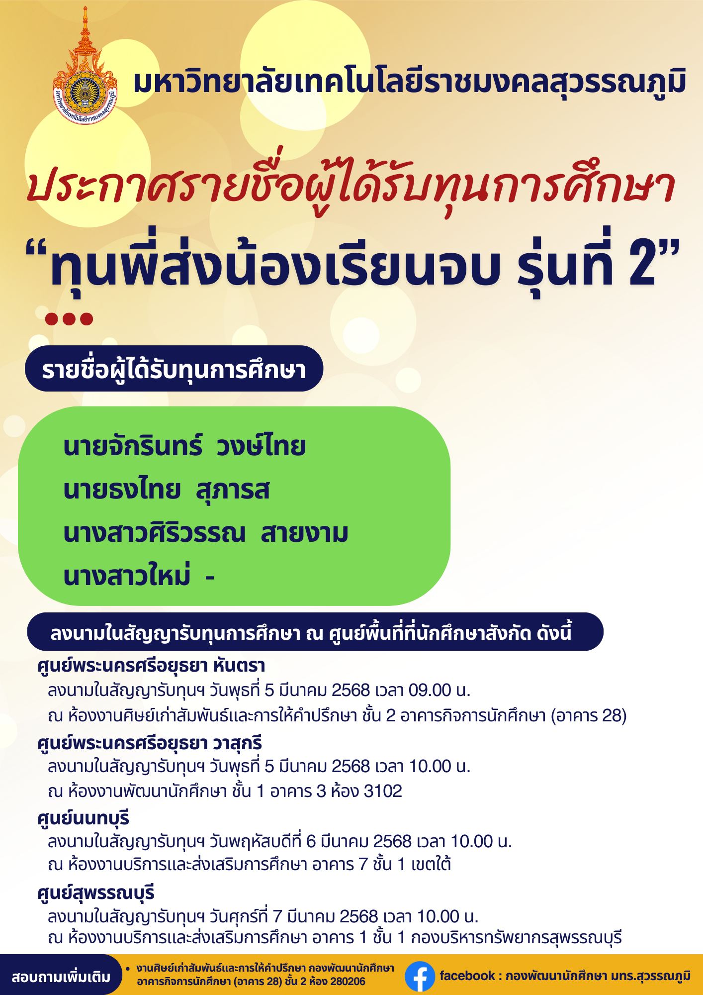 Tag : #rus #rmutsb #กองพัฒนานักศึกษา #มทร.สุวรรณภูมิ #ทุนพี่ส่งน้องให้เรียนจบ ปีการศึกษา 2568