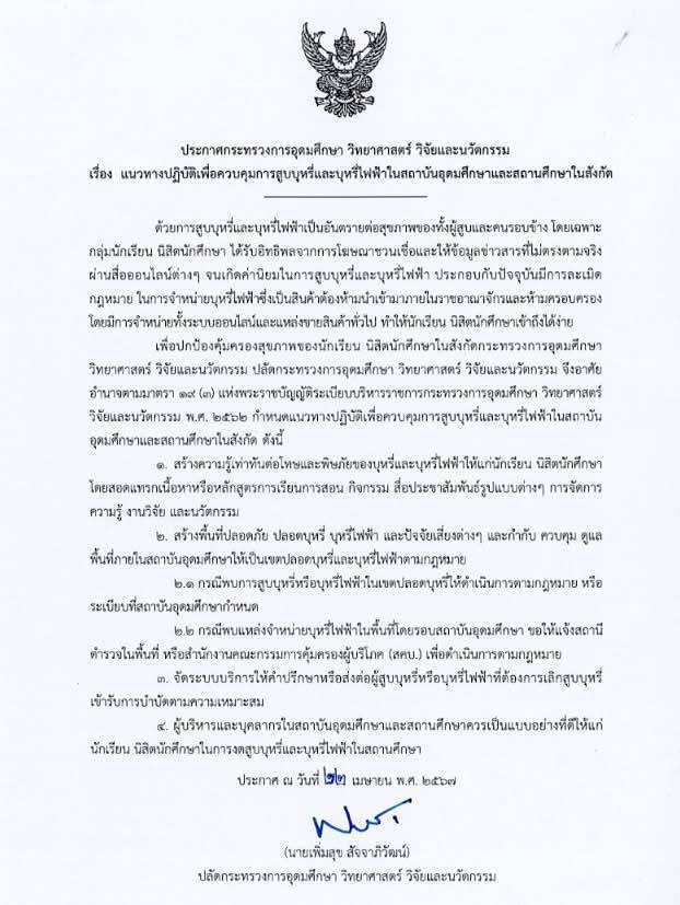 ประกาศ อว. เรื่องแนวทางปฏิบัติเพื่อควบคุมการสูบบุหรี่และบุหรีไฟฟ้าในสถาบันอุดมศึกษาและสถานศึกษาในสังกัด