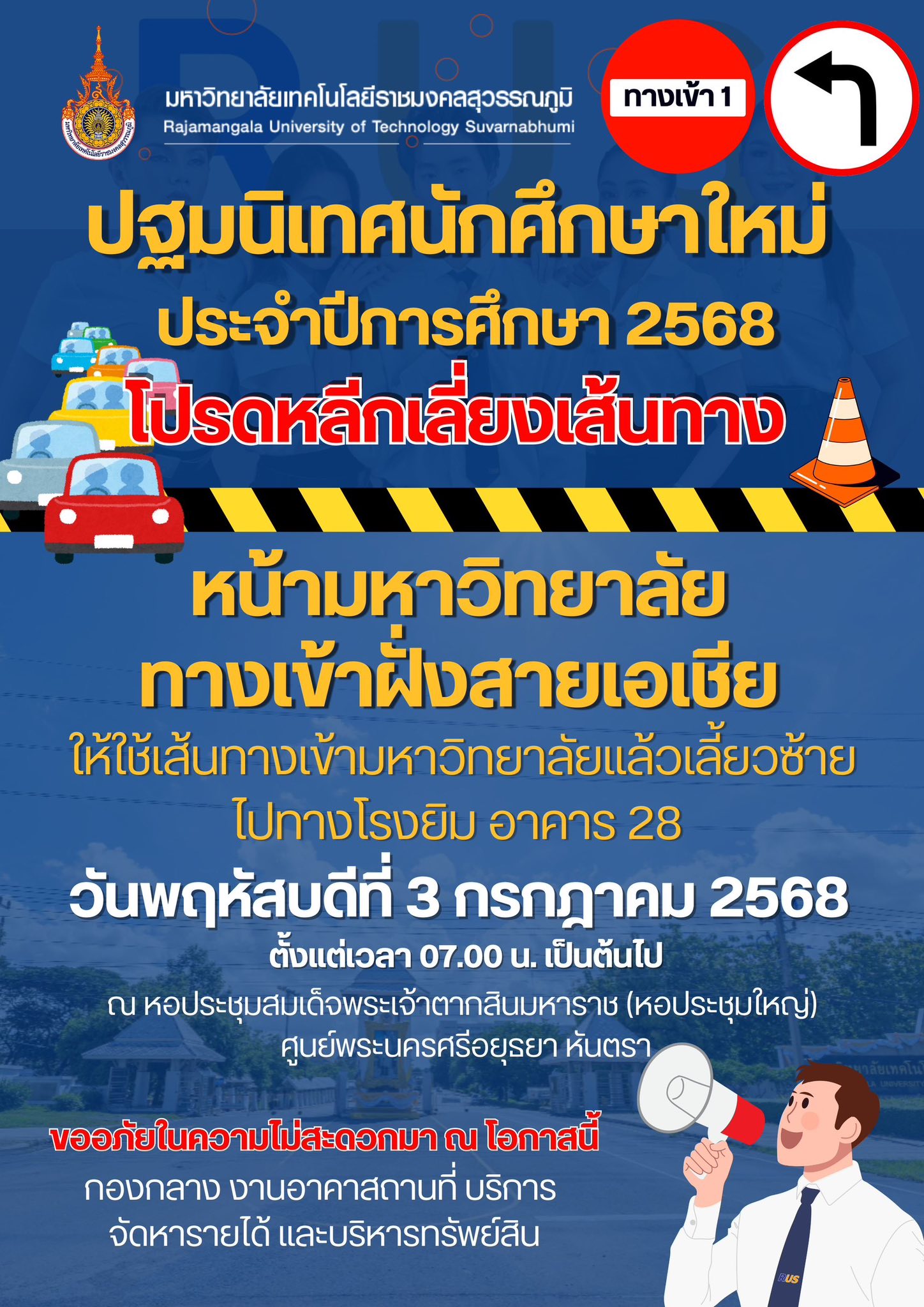 Tag : #rus #rmutsb #กองพัฒนานักศึกษา #มทร.สุวรรณภูมิ #โปรดหลีกเลี่ยงเส้นทาง ปฐมนิเทศนักศึกษา 2568