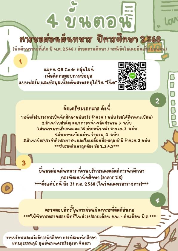 4 ขั้นตอน การขอผ่อนผันทหาร ปีการศึกษา 2568