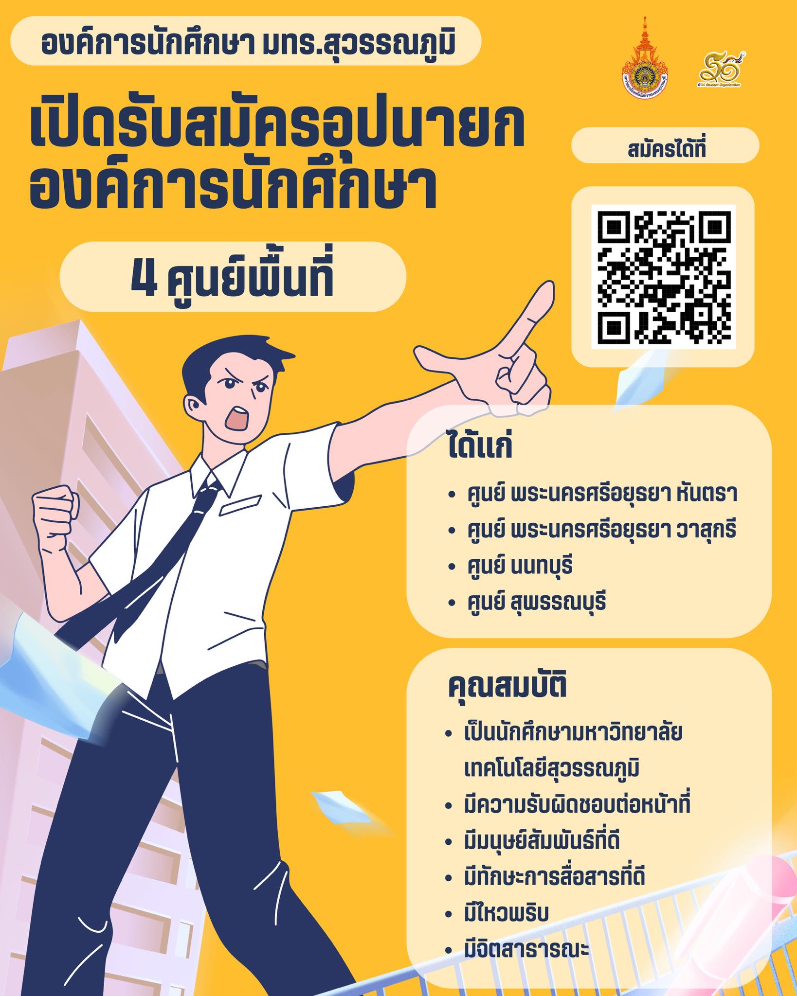 องค์การนักศึกษามหาวิทยาลัยเทคโนโลยีสุวรรณภูมิ เปิดรับสมัครอุปนายกองค์การนักศึกษา 4 ศูนย์พื้นที่
