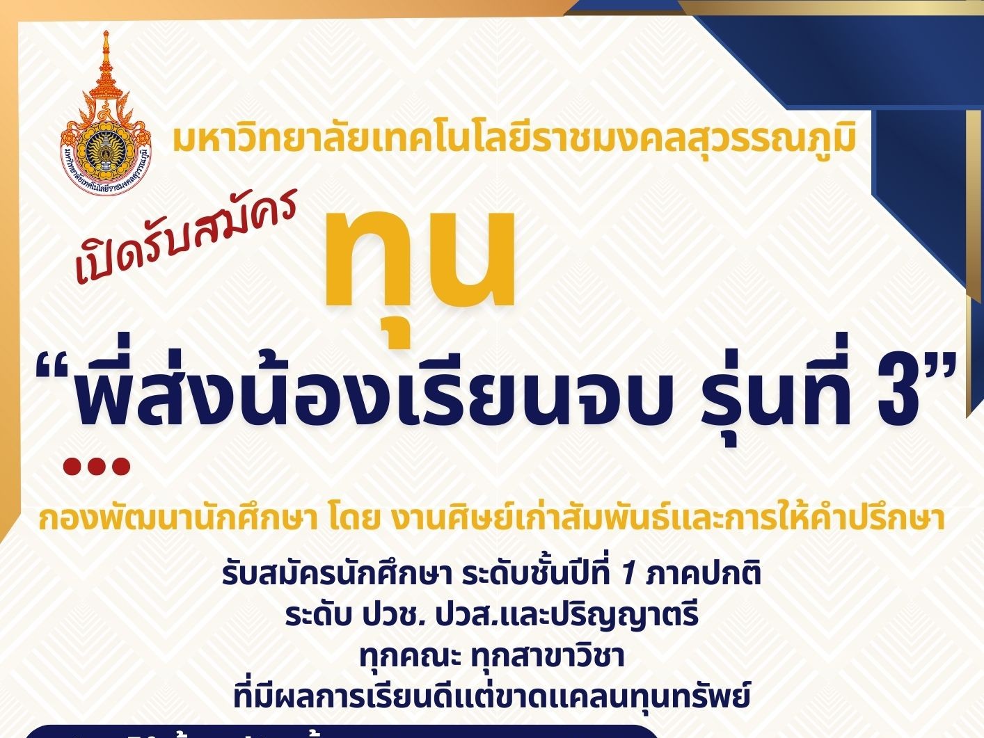 ผลการค้นหาข้อมูล : เปิดรับสมัคร "ทุนพี่ส่งน้องเรียนจบ รุ่นที่ 3"